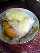 …これはうまいよー!!甘いよ!! カンボジアにもこんな物があったんだと実感。 もっとうまいものいっぱいあるんだろうな。きっと。 かぼちゃのタネ部分にプリンが詰まってて、 その上に氷とココナッツミルクやらなんやらかけて。